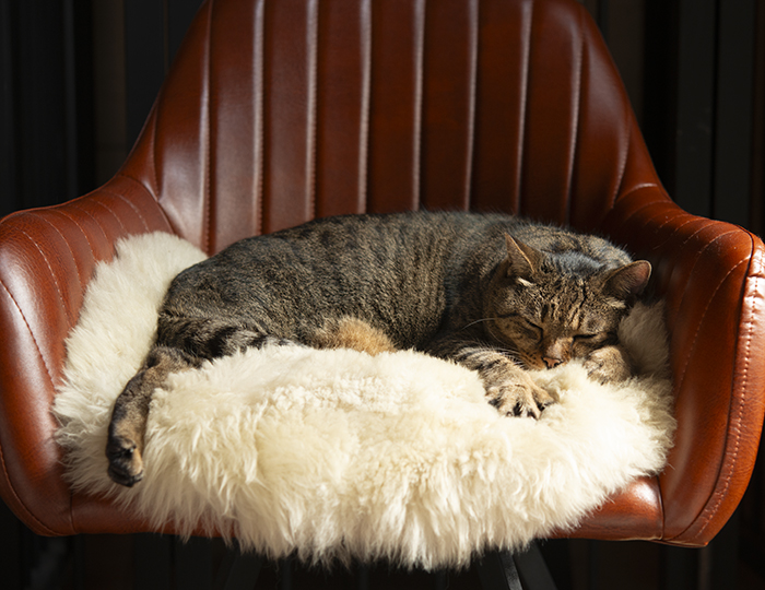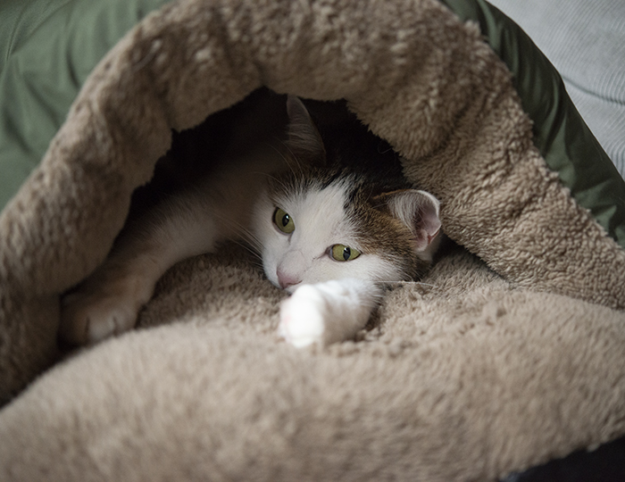 Miri is taking a nap in a fluffy bed on a slightly chilly day.