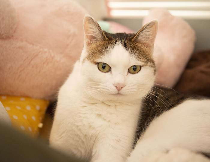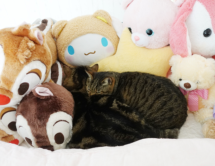そして昨日は、みりがいないなと思って探すと、ベッドの上の、ぬいぐるみに囲まれた場所にいた。