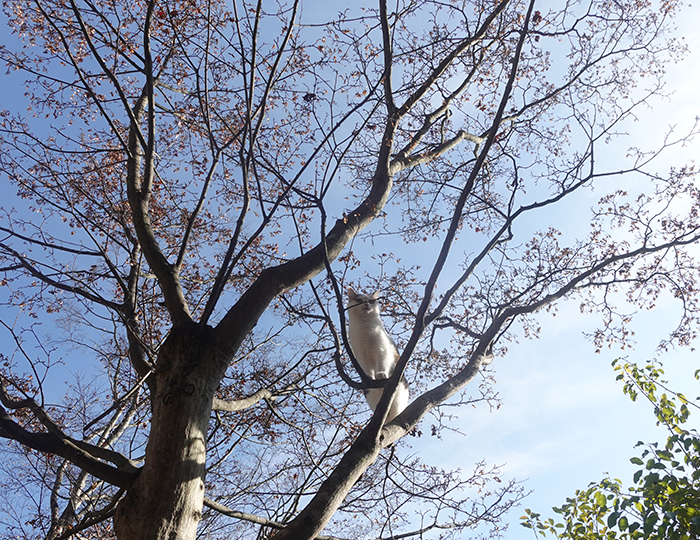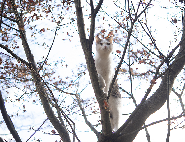The maple tree has lost most of its leaves, so the view from the top of the tree might have improved. And I can watch her well, too