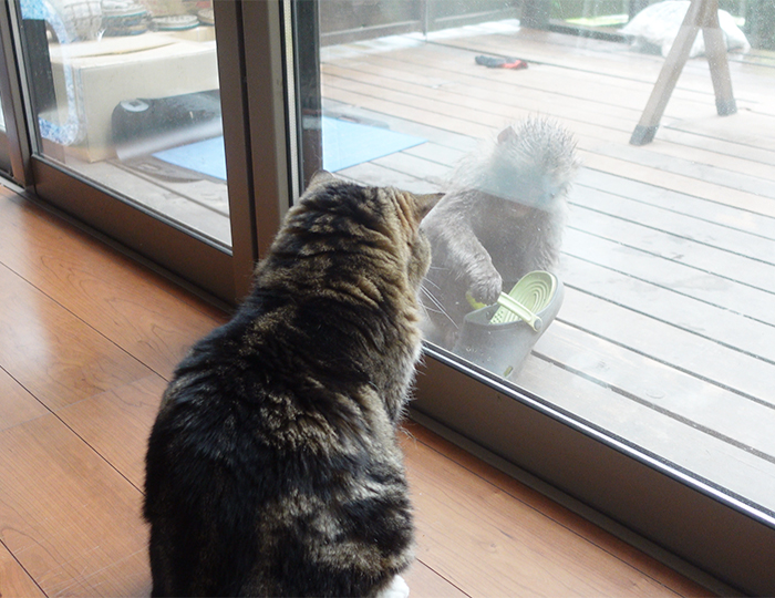 2025年6月に、久しぶりに庭に来たおサルさんと、まるさん。