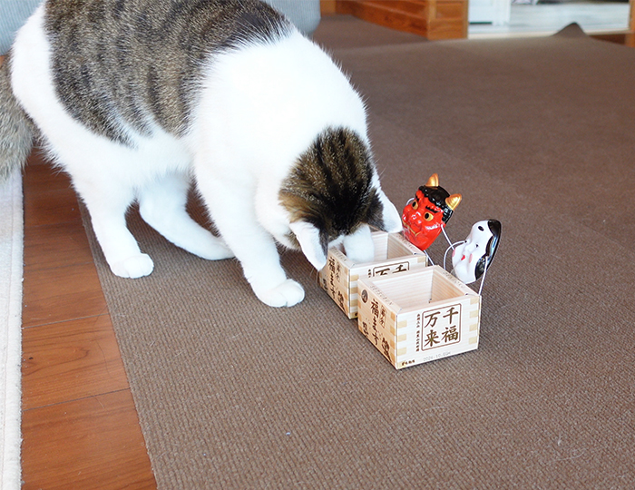 Yesterday was Setsubun, so we had Bean(Cat food)-throwing party!