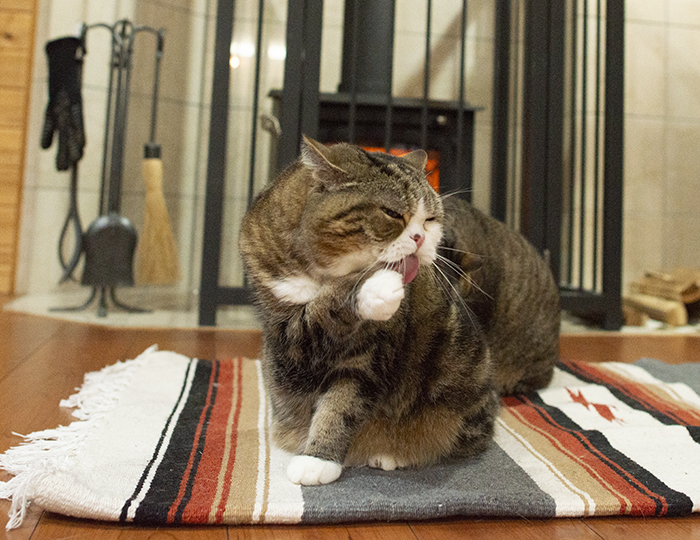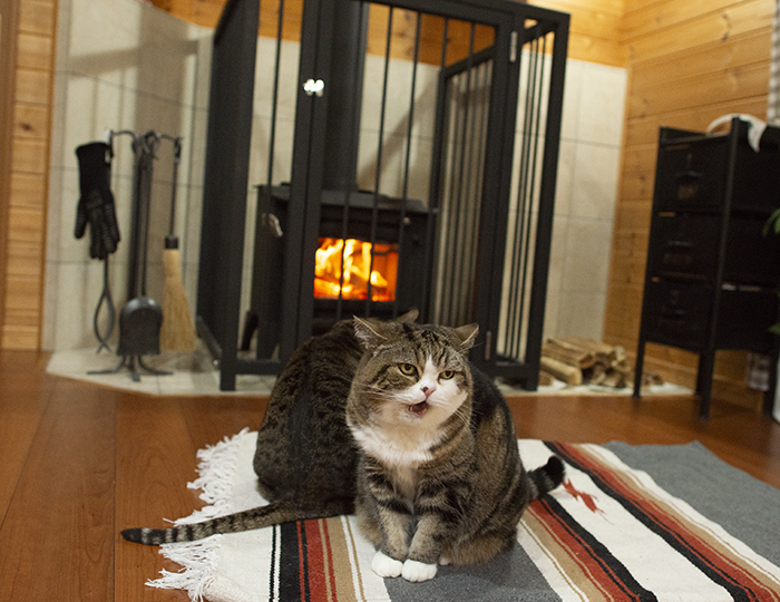 ご飯を食べた後、薪ストーブの前でご馳走様してた。