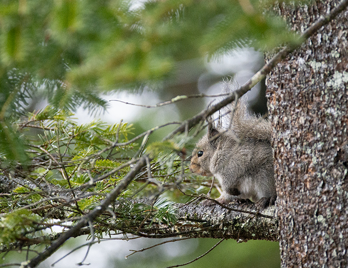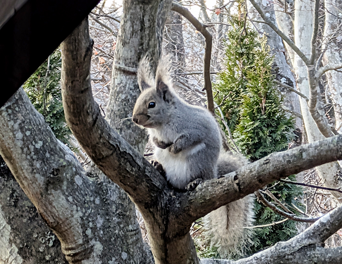In the morning, the squirrel kept looking at us from the top of the maple tree next to the deck.